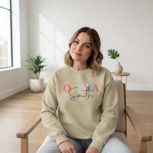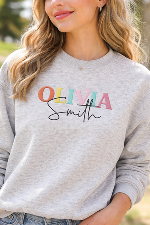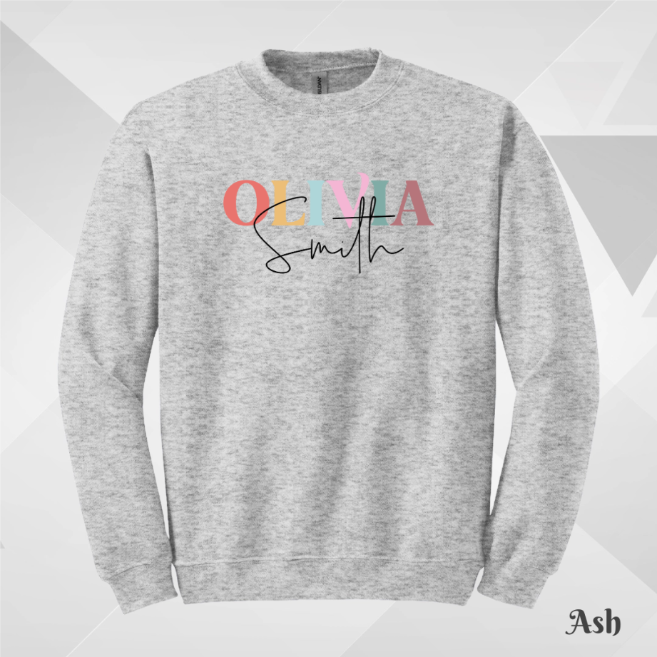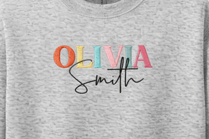 Thiết kế nổi bật với tên được thêu nhiều màu + chữ ký cá nhân bên dưới, tạo cảm giác hiện đại và tinh tế.